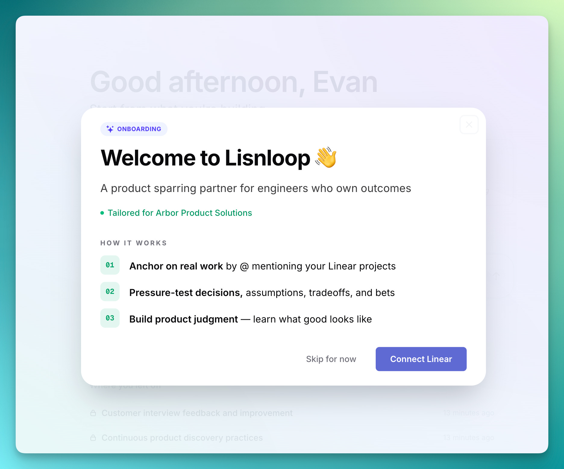What it is: A product sparring partner that makes you sharper at discerning customer signal. Lisnloop has your company and product context from day 1, thanks to a background Company Snapshot at signup, and then it uses your actual work from Linear to ground the conversations.