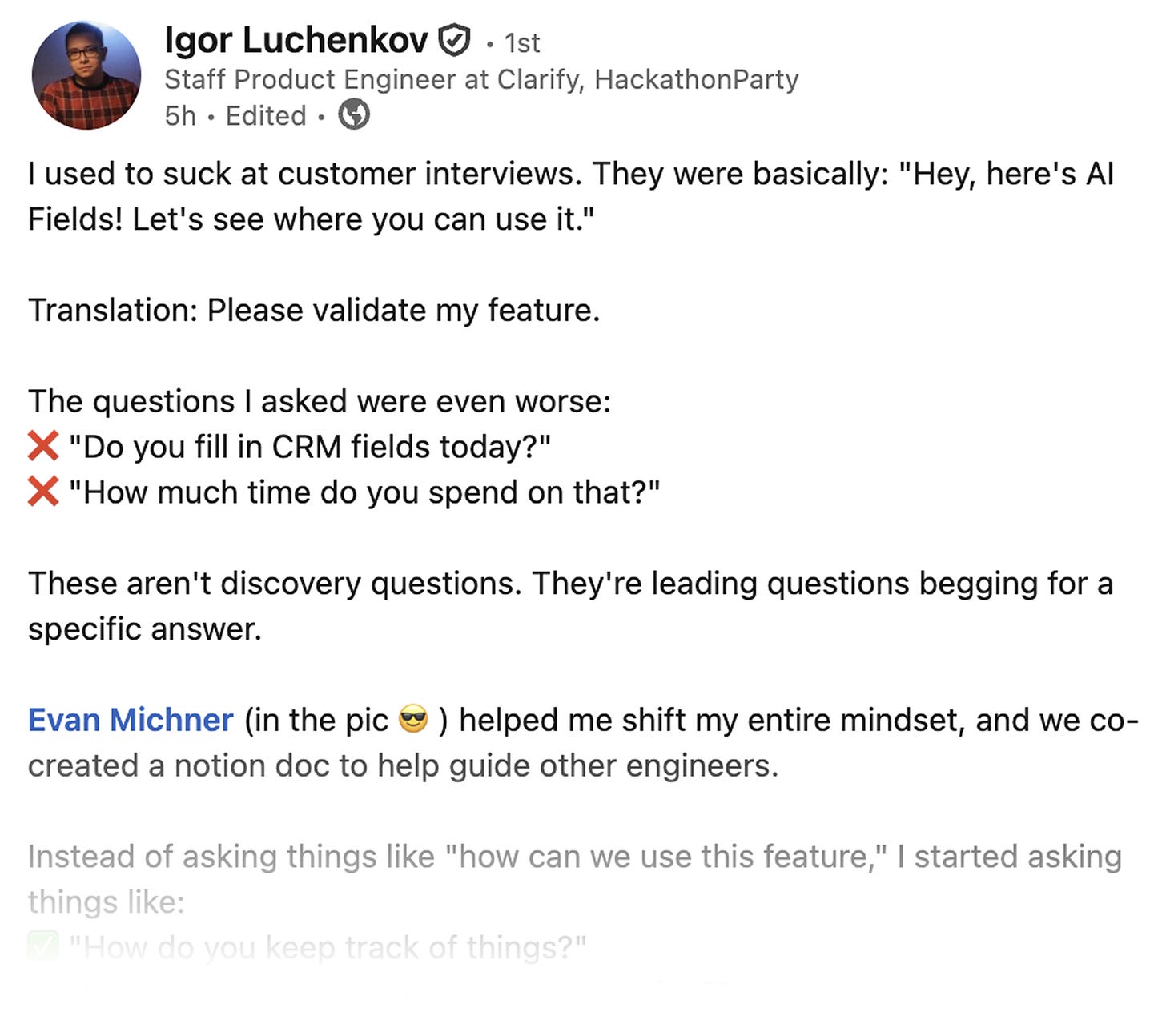 Recently, Igor and I worked together on extracting better insights from customers during prep for a big launch, and he shared his reflections on LinkedIn.